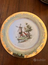 Carinissimo servizio da 12 piatti da dolce + 1 piatto piano, bordo verde e dorato, immagine centrale bucolica-campestre