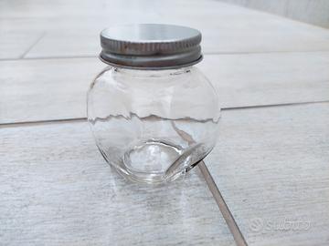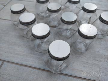 12 vasetti portaspezie o altro con tappo a vite. Alcuni tappi hanno qualche segno e su di uno di intravede la scritta "prezzemolo" che è stata in parte assorbita dal metallo (foto n.5 il primo in basso). Hanno una zona concava sul davanti per poter mettere un etichetta o scrivere sul vetro.