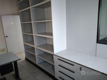 15 Pannelli divisori a parete altezza 300 cm per creare vari uffici: pannelli ciechi con lunghezza 100 cm ciascuno, spessore 15 cm, 2 pannelli vetrati, 3 porte, 2 Armadi a muro lunghezza 400 cm e altezza 300cm, 2 armadi bassi, 2 scrivanie normali, 1 scrivania angolare 200 + 200cm, 8 sedie d'ufficio.