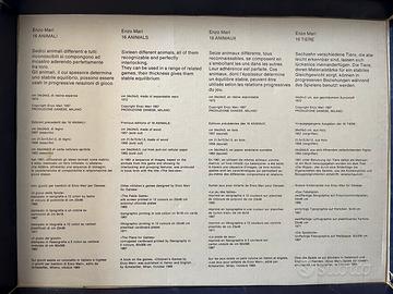 Vera icona del Design, Enzo Mari nel 1957 ispirato dal minimalismo dei giochi in legno scandinavi, ha l'idea di crearne uno che rispecchi gli animali con una forma, il più possibile, reale.