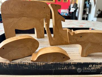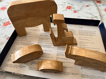 La versione in vendita è la più ricercata di tutte perché è stata realizzata in resina sintetica, un esperimento di materiali dello stesso Enzo Mari, questa serie è stata realizzata solo nel 1972 così come riportato all'interno della confezione. Il logo Danese si trova sull'elefante. Tutti i pezzi sono in perfette condizioni. Anche la scatola originale è praticamente senza danni.?