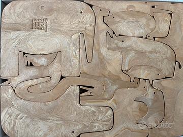 Nasce così il puzzle 3D di 16 sagome stilizzate ma riconoscibilissime, di animali diversi, ottenute grazie al disegno continuo di un pantografo su un blocco rettangolare di legno.