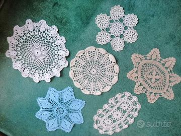 Tre gruppi di bellissimi centrini lavorati a mano all'uncinetto: piccoli, medi e grandi. In perfette condizioni.