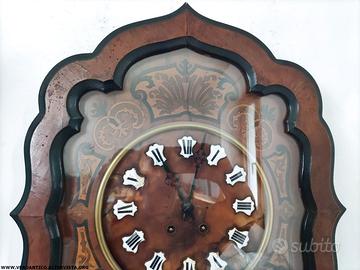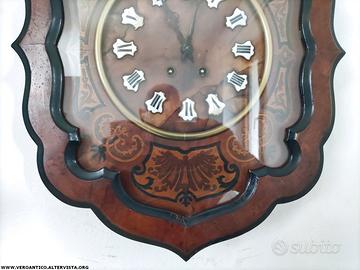 Antico orologio a pendolo a occhio di bue Periodo: primo 900′. Quadrante in marmo, con numeri romani in ceramica e in rilievo. La parte frontale si apre verso l’alto per caricare le molle. Il mobile è arricchito con una elaborata impiallaciatura Dimensioni: 58x48x14 cm L’orologio è revisionato e funzionante. • Desideri ammirare questo orologio da ogni angolazione? • Sul mio sito internet di orologeria VEROANTICO trovi un ricco album fotografico e un video che ne svela ogni dettaglio," • Se acquistate sul mio negozio VEROANTICO la spedizione è inclusa nel prezzo e non avete alcun costo aggiuntivo, • Spedizioni rapide in tutta Italia con corriere espresso 24 ore,