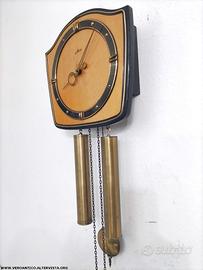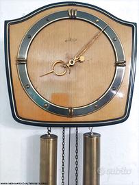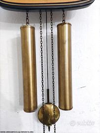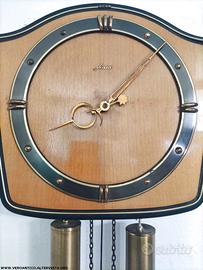 Antico orologio da parete a due pesi. Periodo: anni ’50. Marchio F.H.S. (Franz Hermle & Sons) marchio storico di pendoleria tedesca Meccanismo a pendolo. La suoneria è su tre barre armoniche, suona alla mezza con un bim bam e all’ora fa tanti bim bam quante sono le ore. Dimensioni 30x28x16 cm (solo il quadrante). I pesi sono in piombo rivestiti di ottone per avere un aspetto dorato lucido. Il meccanismo è del tipo a pesi, con il passare del tempo scendono e forniscono all’orologio l’energia necessaria per il funzionamento. La carica dura una settimana e dopo i pesi devono essere riportati in alto (operazione semplice e rapida). I colori, la patina del mobile e dei pesi sono quelli originali. Meccanica di ottima realizzazione con ingranaggi modulari in bronzo. La lente del pendolo è fatta in lamina di ottone. L’orologio è funzionante (revisiono personalmente i miei orologi). • Desideri ammirare questo orologio da ogni angolazione? • Sul mio sito internet VEROANTICO trovi un ricco album fotografico e un video che ne svela ogni dettaglio," • Come orologiaio artigiano, ho revisionato personalmente questo pezzo e molti altri che potrai scoprire nel mio catalogo online, • Spedizioni rapide in tutta Italia con corriere espresso 24 ore,