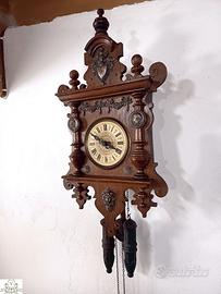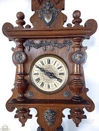 Antico orologio a pendolo foresta nera del XIX secolo Periodo: 1800 / 1900. Il meccanismo ha la struttura in legno di faggio e bronzine incastonate in questa struttura. Il quadrante è finemente decorato. Il mobile è arricchito con lamine di ottone cesellate che mostrano volti di donna. Laterali del mobile a mezze colonne. La parte frontale del mobile è realizzata su più livelli e i numerosi inserti in rilievo danno un’idea di profondità. L’orologio è funzionante. Batte le mezze ore e all’ora fa i rintocchi delle ore. Suoneria su spirale armonica con suono gradevole. Il pendolo ha la lente rotonda e in legno. Il meccanismo è del tipo a pesi, con il passare del tempo scendono e forniscono all’orologio l’energia necessaria per il funzionamento. La carica dura un giorno e dopo i pesi devono essere riportati in alto (operazione semplice e rapida). I pesi sono in ghisa a forma allungata e lavorata. Due finestrelle laterali consentono di osservare il meccanismo. Il mobile, i pesi, il pendolo hanno la loro patina originale dovuta al tempo. Dimensioni HxLxP: 55x28x17 cm. • Desideri ammirare questo orologio da ogni angolazione? • Sul mio sito internet di orologeria VEROANTICO trovi un ricco album fotografico e un video che ne svela ogni dettaglio," • Se acquistate sul mio negozio VEROANTICO la spedizione è inclusa nel prezzo e non avete alcun costo aggiuntivo, • Spedizioni rapide in tutta Italia con corriere espresso 24 ore,