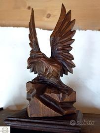 Sulla parte alta del mobile domina un’aquila in legno di noce molto ben scolpita.