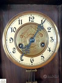 Antico orologio Gustav Becker Periodo: 1900/1920. Marchio: Gustav Becker (importante marchio storico di pendoleria tedesca). Quadrante con numerazione araba. Il pendolo, esterno al mobile, è in lamina di bronzo finemente cesellato. Sulla parte alta del mobile domina un’aquila in legno di noce molto ben scolpita. La suoneria suona alla mezza e all’ora fa i rintocchi delle ore. Il mobile ha la sua patina originale. Laterali a mezze colonne molto ben realizzate. Tutto il movimento meccanico è in bronzo. Dimensioni: 78x40x19 cm. Completo di chiave di carica. L’orologio è funzionante (revisiono personalmente i miei orologi). • Desideri ammirare questo orologio da ogni angolazione? • Sul mio sito internet di orologeria VEROANTICO trovi un ricco album fotografico e un video che ne svela ogni dettaglio. • Se acquistate sul mio negozio VEROANTICO la spedizione è inclusa nel prezzo e non avete alcun costo aggiuntivo. • Spedizioni rapide in tutta Italia con corriere espresso 24 ore.