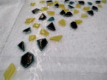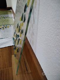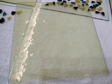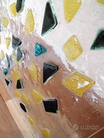 18 formelle in vetro artistico, misura 25 cm per 25 cm e 4 cm di spessore. Colorazione su toni verde e giallo acetato. Ogni formella è costituita da 2 lastre di vetro fuse insieme (una liscia e una a lavorazione leggermente butterata), alcune con schegge di vetro colorato fuse in superficie. Assolutamente integre e perfette, no graffi, no crepe, no rotture. Ottime per creare una vetrata artistica, un séparé, o decorare una porta o il ripiano di un tavolo. Io le avevo montate su un telaio in legno bianco come in ultima foto, che fornisco insieme ai binari per fissarlo al muro (misura telaio 267 cm per 55 cm, spessore 2,5 cm). Ordinate a Venezia nel 1992 e pagate una cifra che preferisco dimenticare... NON SPEDISCO. Visione e ritiro a Oderzo (TV) previo appuntamento al 347.7412305.