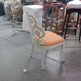 18 Fusti Sedia modello Ricciolo realizzata con schienale in multistrati di faggio curvato, struttura in massello di faggio grezza, il costo di cadauno fusto è di 30,00 netti la sedia può essere fornita anche verniciata con colore a richiesta e tappezzata con rivestimento a scelta tra ecopelle o tessuto, in questo caso il costo per l'intero lotto può aggirarsi sui 70/80 euro cadauna e per definirlo possiamo fornire un preventivo. Si tratta di una rimanenza di un lotto di sedie prodotte come la foto in anteprima per un Hotel