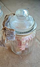 Vendo 19 barattoli in vetro nuovi con tappo, decorati nastro juta, fiocco e etichetta "spezie" - stile shabby per bomboniere, confetti, spezie o regali cucina/matrimonio.