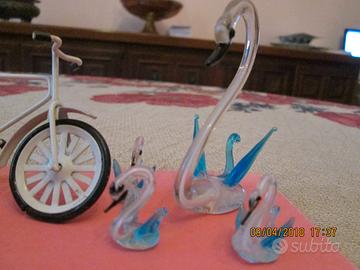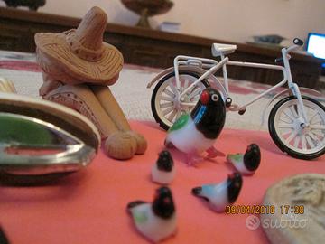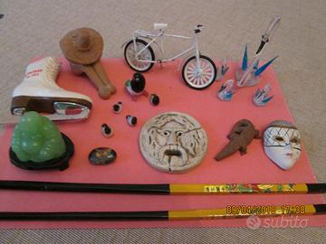 Piccoli oggetti vari: in tutto 19 pezzi - famiglia di cigni in vetro 4 pezzi - famiglia di piccioni in vetro 5 pezzi - una piccola bicicletta - un piccolo pattino da ghiaccio - un piccolo budda verde su piedestallo nero - 2 bacchette cinesi - la bocca della verità - un piccolo coccodrillo in legno - una piccola maschera - un piccolo sasso - un piccolo messicano in terracotta.