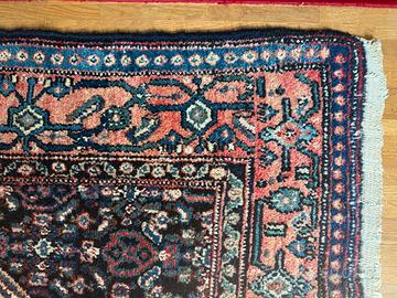 I tappeti Senneh sono caratterizzati dalla loro tessitura stretta e precisa con nodo asimmetrico (persiano), che crea motivi delicati e dettagliati. Il pannello centrale presenta un tradizionale motivo Herati nei toni caldi del rosso e del blu intenso, incorniciato da un bordo armonioso con elementi floreali e geometrici.