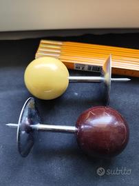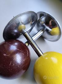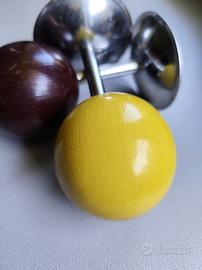 1960. Ganci appendiabiti industriali a muro design Osvaldo Borsani 1960. Ganci appendiabito industriali per ambienti di lavoro Questi ganci sono un piccolo ma affascinante esempio di design industriale Mid-Century Modern. Nonostante la loro apparente semplicità, hanno una funzione molto specifica e un'estetica tipica di quel periodo. Si tratta di appendiabiti a muro (o pomelli da parete), di produzione europea (molto comuni in Italia, Germania e Francia tra la fine degli anni '40 e i primi anni '60). Il Design: La forma a "pallina" in bachelite o plastica dura colorata (il giallo "senape" e il marrone "testa di moro" sono colori iconici dell'epoca) serviva a non segnare o deformare i colletti dei cappotti. La Struttura: La base a disco in metallo cromato serve a distribuire il peso sulla parete e a nascondere il punto di fissaggio. La vite lunga che vedi serve per un ancoraggio profondo, spesso direttamente nel legno o tramite tasselli nel muro. Stile: è lo stile del designer Osvaldo Borsani nelle produzioni di aziende come Valli & Valli, che nobilitavano oggetti d'uso quotidiano con materiali moderni come l'acciaio e le resine plastiche.