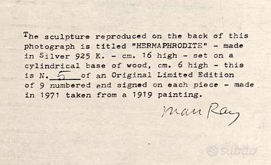 La figura distorta di Hermaphrodite fu originariamente scolpita e dipinta nel 1919. Nella mitologia greca, Ermafrodito era un dio greco figlio di Hermes e Afrodite, che racchiudeva in sé entrambi i sessi e, perciò divenuto simbolo della fertilità. Man Ray enfatizza l'anatomia femminile esagerando la rotondità dello stomaco e delle cosce. Il titolo dell'opera ed il modo scelto dall'artista per scolpirla, con braccia e gambe incomplete, evoca una scultura arcaica deteriorata dal tempo. (Luce Foundation Center for American Art)
