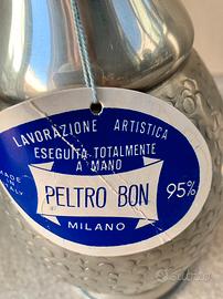 2 anfore in peltro 95% marchio Peltro Bon anni 70 completamente lavorate artisticamente a mano. Le anfore sono alte 33 cm ed hanno diametro 12 cm. Posseggono il certificato di garanzia dell'epoca ed il marchio stampato all'interno della base. Si trovano in perfetto stato. Verranno perfettamente imballate e spedite.