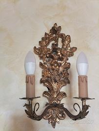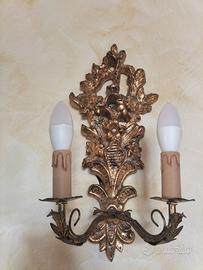 Coppia di applique a due luci in legno intarsiato e metallo color oro