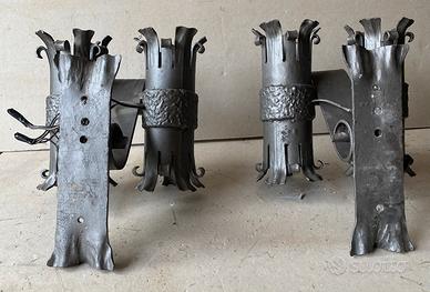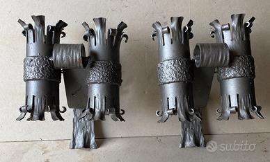 Coppia di appliques in ferro battuto e verniciate, a due lampade, costruite artigianalmente, esemplari unici. Misure: altezza portalampade cm. 25, larghezza ingombro cm. 25, altezza staffa fissaggio leggermente obliquo cm. 26. Condizioni: ottime. Questo articolo vintage/antico non ha difetti ma potrebbe presentare piccoli segni del tempo Dispongo di altre appliques (2+1 uguali) sempre in ferro battuto artigianali.