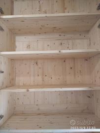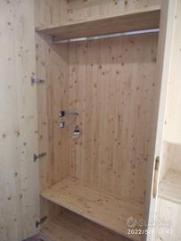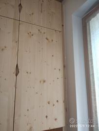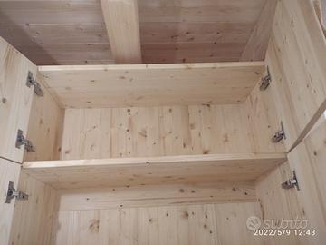 01 armadio costruito in abete massello con misura lungh. Totale 230 prof.60 h 240 disposto in 2 moduli nel prima 1° vano sx da 115 con 2 ante lisce che si apriranno su cerniere regolabili ammortizzate in chiusura con fresata gola triangolo per apertura. Interno disposto con ripiano sotto aggiustabile in altezza con ferramenta adatta, sopra ripiano sempre aggiustabile con bastone in alluminio porta abiti. Nell'altro vano predisposto 6 ripiani tutti aggiustabili in altezza con ante che chiudono il tutto. Sotto piedini livellatori per mettere a bolla il tutto h 10 cm lo zoccolo. schienale posteriore da 14 mm. 01 armadio tutto spessore 24 mm in abete massello con misura lungh. Totale 205 prof.50 h 260 disposto in 2 moduli in cui nel prima 1° vano sx con 2 ante lisce con fresata gola per apertura su cerniere da cucina regolabili ammortizzate in chiusura. Interno ripiano sotto aggiustabile in altezza, sopra ripiano aggiustabile con bastone in alluminio porta abiti e 2 ante più piccole nella parte superiore per riporre il cambio di stagione. Nell'altro vano predisposto 2 ante sotto con ripiano interno aggiustabile senza schienale per ispezione tubi, vano a giorno parte centrale e sopra troveremo 2 ante + lunghe con 2 ripiani interni aggiustabili e sopra 2 piccole per il cambio di stagione. Sotto piedini livellatori h 10 cm lo zoccolo. schienale posteriore da 14 mm con fascia alle estremità. ferramenta idonea per la giunzione del tutto. Finitura oliata. Il prezzo si intende franco fabbrica con finitura iva esclusa. costruito su commissione ed esigenze del cliente, non è disponibile a magazzino ma essendo i diretti produttori falegnami possiamo riprodurlo uguale o in base alle proprie esigenze. per domande o dubbi contattateci P.S. disponibili a dare suggerimenti o chiarimenti in merito, per noi conta dare vita al vostro sogno DIRETTAMENTE DAL PRODUTTORE ASTENERSI RIVENDITORI O COMMERCIANTI