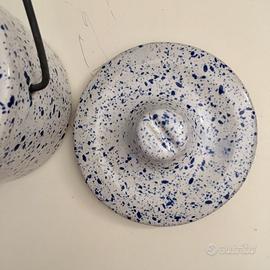 Vendo 2 barattoli artigianali in ceramica con chiusura ermetica (mancano le guarnizioni, quelle della Weck arancioni vanno bene) bianco/grigio chiaro con macchie blu.