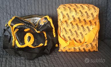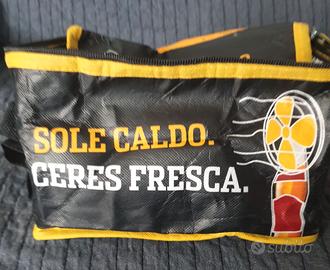 Coppia di gadget originali Birra Ceres da collezione, perfetti per l'estate: Borsa termica nera e gialla con scritta "Sole Caldo. Ceres Fresca." (dotata di tracolla) misura 20x13 H 15 cm. Borsa shopper/mare gialla con logo Ceres all-over misure 18x18 h 20 cm. Entrambe in ottime condizioni, ideali per amanti del brand o collezionisti di memorabilia vintage.