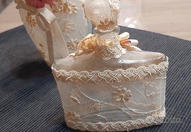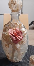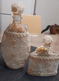 2 bottiglie in vetro , ricoperte da pizzo con rose una bianca e l'altra corallo chiaro .Belle mai usate e come nuove .Da usare come soprammobile , o porta sali da bagno o a fantasia. Come nuove ! belle , idee regalo.