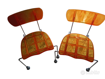 "Sedie ""Broadway"" di Gaetano Pesce, prodotte da Bernini, con quattro piedi rivestiti in gomma e poggianti su molle. Modello 543, creato nel 1993 per Bernini Raro set di 2 pezzi con colore arancione. Ottime condizioni, colori brillanti e nessuna crepa. Collezione completa originale composta da 2 sedie arancioni. Caratterizzate da piedini a molla per dondolarsi dolcemente in base alla postura di chi è seduto. Sedute e schienali realizzate in resina epossidica multicolore marmorizzata trasparente. Nessuna Broadway è uguale, solo pezzi unici. In produzione i colori si mescolavano con resina in modo casuale per creare cromatismi diversi. Fuori produzione. PEZZI DI RICAMBIO INCLUSI / Dimensioni: Altezza: 73,66 cm (29 in)Larghezza: 38,1 cm (15 in)Profondità: 43,18 cm (17 in)Altezza della seduta: 44,45 cm (17,5 in) ACCETTO OFFERTE SENSATE E DA PERSONE ESPERTE CHE SAPPIANO DI CHE ARTICOLI SI PARLA. altissimo Design PEZZI DI RICAMBIO SOLO SU RICHIESTA "
