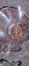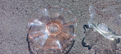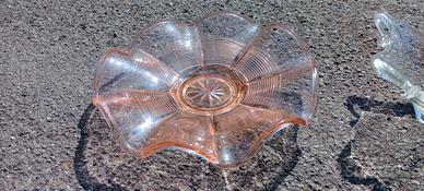 2 centrotavola Vintage in vetro di Murano di due epoche diverse, perfetti senza alcuna parte danneggiata, hanno solo in alcuni punti le tipiche piccole bollicine del raffreddamento del vetro, tipiche della lavorazione di Murano. Quello rosa è del 1930 circa ed è un pezzo unico nel suo genere, fatto a mano come tutti i Murano e presso stampato al centro con un motivo floreale stile antico. L'altro trasparente è del 1970 circa, presenta riflessi madreperlacei ma è in vetro trasparente e dipende dall' angolazione della luce ha riflessi arcobaleno e madreperlacei, con ai bordi dei ricami a ricciolo tipici della lavorazione di Murano in vetro della stessa fusione di un unico pezzo, straordinario esempio di artigianato italiano di Murano. Cedo per inutilizzo anche separatamente (nel caso inviare messaggio), spedisco con pacco tracciabile super imballato con il mio corriere.