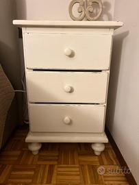 2 comodini alti di color chiaro con 3 cassetti. Stile shabby.