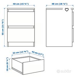 vendo per inutilizzo 2 comodini IKEA con 2 cassetti di colore bianco, già montati, e delle dimensioni meglio descritte in foto. Piccolo difetto in un solo comodino come in foto. Ritiro nel comune di Opera (MI). Contattare solo se interessati.