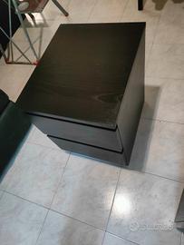Due comodini IKEA della serie MALM. Il colore è quello Ikea marrone/nero. sono tenuti bene. Esternamente non presentano particolari segni di usura se non quelli dati dal tempo. i cassetti risultano funzionali. Gli interni del cassetti sono in ordine ma in uno sono presenti macchie come da foto.