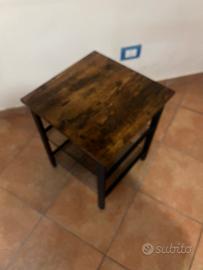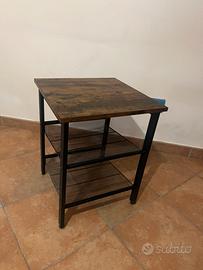 Comodino/tavolino stile industriale con struttura in metallo nero e ripiani effetto legno scuro.