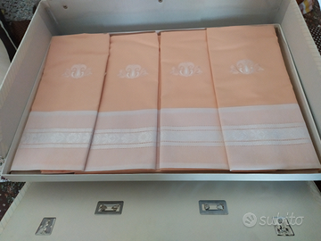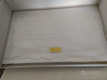 2 completi lenzuola matrimoniale, uno rosa e uno grigio, con balze ricamate, con federe + copriletto bianco in misto seta.....acquistato da rappresentanti FELTEX.... ancora nella scatola....