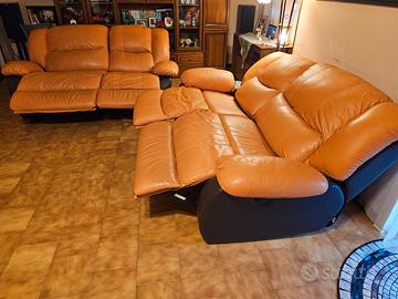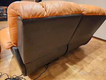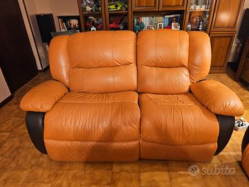 Vendo una coppia di divani in vera pelle (3 posti e 2 posti) con tutte e 4 le sedute motorizzate elettricamente. Le sedute e braccioli sono di colore arancione ed il fondo posteriore dello schienale color marrone. Il tutto in ottime condizioni e perfettamente funzionanti.
