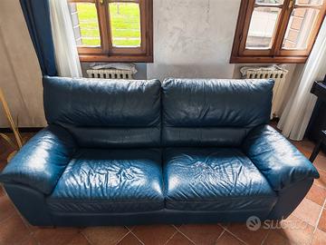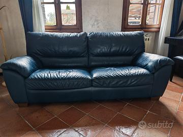 vendo 2 divani in pelle blu in buone condizioni con segni di normale utilizzo. Uno da 2 posti larghezza 160 cm e profondità 88 cm ed uno da 3 posti larghezza 195 cm e profondità 88 cm. Possibilità di trasporto al vostro domicilio fino al piano terra.