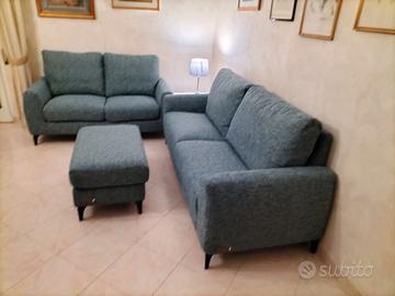 Vendo 2 divani completi di poggiatesta e pouf. Tutti gli elementi sono in tessuto DIM.
