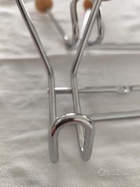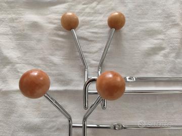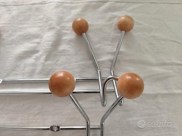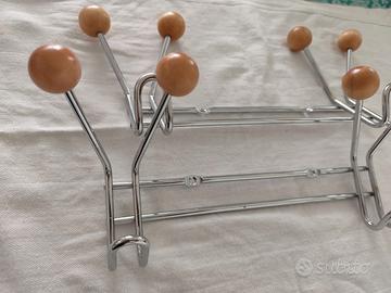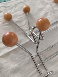 1970. 2 Ganci appendiabiti industriali per ambienti di lavoro 12 posti Questi ganci sono un classico esempio di industrial design funzionale degli anni '70, un periodo in cui l'estetica degli uffici e delle fabbriche ha iniziato a mescolare la freddezza del metallo con dettagli più caldi e "domestici". 1. Estetica e Materiali Il contrasto materico: La struttura in acciaio cromato (o nichelato) è tipica della produzione industriale di massa di quegli anni. La scelta delle pomine in legno massello sferiche o in resina dura non è solo estetica: serviva a evitare che i tessuti dei cappotti o delle tute da lavoro si segnassero o si strappassero, cosa che accadeva spesso con i ganci a punta nuda. Stile "Atomic" o Space Age: Sebbene siano pezzi industriali, la forma a "V" dei bracci e le sfere terminali strizzano l'occhio allo stile Space Age, rendendoli oggi molto ricercati per l'arredamento vintage e modernariato. 2. Funzionalità Industriale Configurazione a binario: Questi ganci erano progettati per essere montati in serie su lunghe pareti di spogliatoi, uffici tecnici o corridoi scolastici. La struttura a doppio binario parallelo garantisce una stabilità maggiore rispetto ai ganci singoli. Doppia presa: Il design permette di appendere un cappotto sulla parte alta (la sfera) e una borsa, una sciarpa o un cappello sull'asola metallica inferiore. È un uso dello spazio estremamente efficiente. 3. dove posizionarli: Sono perfetti in un ingresso minimalista o in un bagno per gli asciugamani. Il mix resina/metallo li rende facili da abbinare sia con mobili in rovere che con scaffalature in ferro. Curiosità: Molti di questi pezzi venivano prodotti da aziende storiche dell'arredo tecnico (come la Olivetti Synthesis o ditte specializzate in forniture per la pubblica amministrazione).