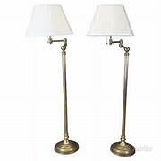 2 lampade da terra a braccio oscillante Ralph Lauren Visual Confort Sargent in ottone Nature con paralumi. Le lampade sono dotate di due luci ciascuna, entrambe con il proprio interruttore. altezza 162,56 cm - Larghezza 81,28 cm - Profondità 50,8 cm - fine xx secolo