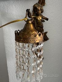 Coppia di appliques in ottone con amorini che reggono un paralume in vetro. Da uno dei paralumi mancano alcune gocce. Filo elettrico da sostituire. Anni 1940/1950