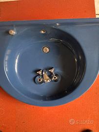 2 lavabi a parete sospesi in ceramica blu. Dotati di accessori a parete, come da foto, manopole acqua calda, fredda e beccuccio.