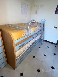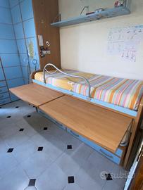 In omaggio: mensole della prima foto, scaletta per raggiungere il letto superiore e barriera di protezione salva bimbo. Il letto superiore sì sposta con le ruote é dotato di 2 scrivanie estraibili e 2 cassetti sotto le scrivanie. Il letto inferiore è a scomparsa con ruote e ha 4 cassetti sotto il letto. Colori celeste e faggio. Ritiro sul posto no spedizioni