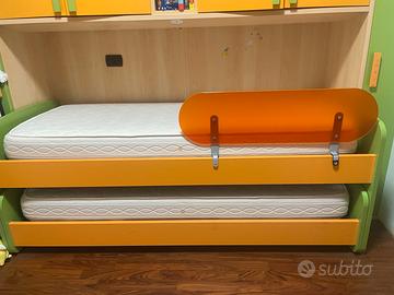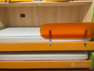 2 letti singoli, letto estraibile salvaspazio.Con Reti A Doghe E Materassi. Colore verde e arancio. Con barriera anticaduta bambino.