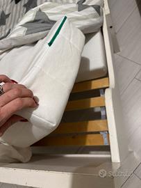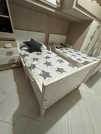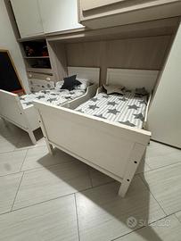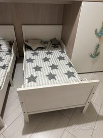 2 lettini ikea per bambini allungabili con doghe e materassi componibili in 5 pezzi misure 85x 190 altezza 40 nella foto e’ montato con 4 pezzi e arriva a 150 cm per bambini di 6 anni . Colore bianco anticato Occasione! Solo ritiro!