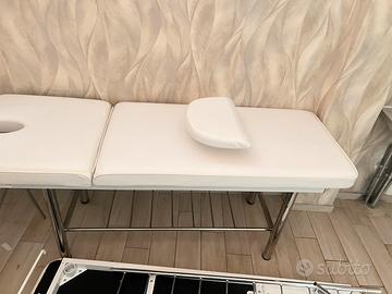 Vendo 2 lettini per uso estetico in ecopelle bianchi, piedi in acciaio , schienale regolabile, porta carta , ringhiera sotto in acciaio per appoggiare asciugamani ecc , uno larghezza 63, prezzo per ciascuno 200€ per tutti due trattabile
