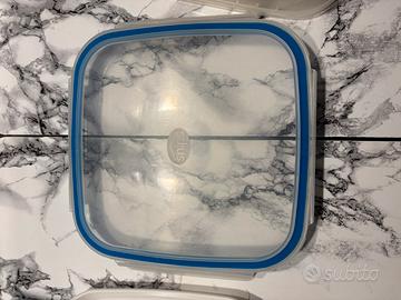 - Contenitori trasparenti con coperchio bianco.