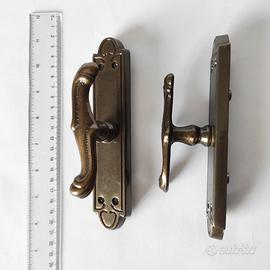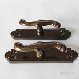 Coppia di maniglie per finestre in metallo brunito, stile antico, complete di placche originali. Design elegante con linee morbide e dettagli decorativi, tipici della ferramenta d’epoca. Presentano una patina naturale del tempo che ne valorizza il carattere e l’autenticità.
