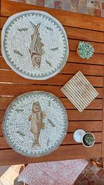 2 bellissimi mosaici eseguiti a mano da un artigiano Tunisino di Carthage in stile Opur Vermiculatum Romano- 35 cm di diametro, quello che si vede in foto è la parte posteriore, vengono consegnati semplicemente incollati per poter essere applicati su qualsiasi superficie (muri- pavimenti - tavolo ) da un piastrellista o altro professionista.