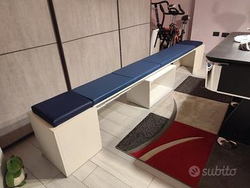Vendo 2 panche identiche per tavolo consolle allungabili fino a 3 metri ciascuna. Struttura bianco opaco e cuscini per seduta in ecopelle blu, inclusi nella struttura. Pagati entrambi in totale 850 € compresa iva, come si evince dalle fatture allegate. Vendo per mancato utilizzo, praticamente nuove, mai usate.