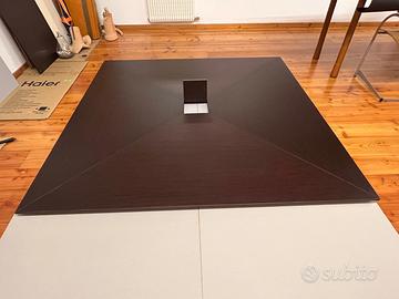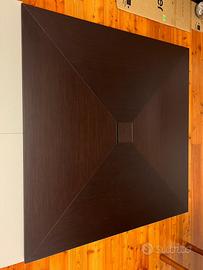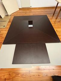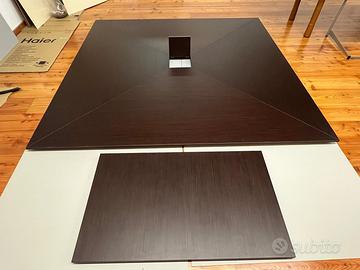 2 piani tavolo misure - 200x200 cm - 100x60 cm. Finitura legno marrone Wenge’, tavolo grande 4 spicchi smontabili con sportellino apribile. Entrambi con spessore 3 cm