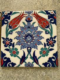 Il prodotto contiene 2 piastrelle ceramiche smaltate di 20x20 cm ciascuna, provenienti dalla fabbrica di Iznik in Turchia, famosa per la sua tradizione ceramica. Le piastrelle sono decorate con motivi geometrici e floreali, ispirati alle piastrelle siciliane, tunisine e marocchine, che conferiscono un tocco di originalità e stile.